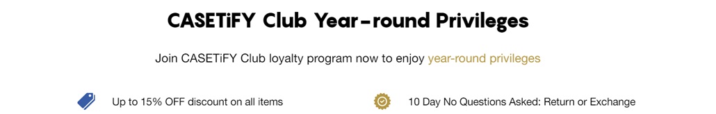 Szüksége van még több okra, hogy a CASETiFY-t válassza? Koncentráljon a CASETiFY használatának hihetetlen előnyeire. A 100%-os elégedettségi garancia politikával 6 hónapos termékgaranciát élvezhet minden CASETiFY-tól vásárolt termékre, és ha Ön arany tag, akkor 12 hónapos termékgaranciát kap. Ingyenes világméretű szállítást is kaphat az ingyenes visszaküldés mellett, és lehetősége lesz extra pénzt nyerni a hivatalos jutalomprogramoknak köszönhetően.