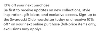 Feliratkozás Swarovski.com és megragad ez a kupon, hogy mentse 10% kedvezmény a megrendelés a pénztárnál.